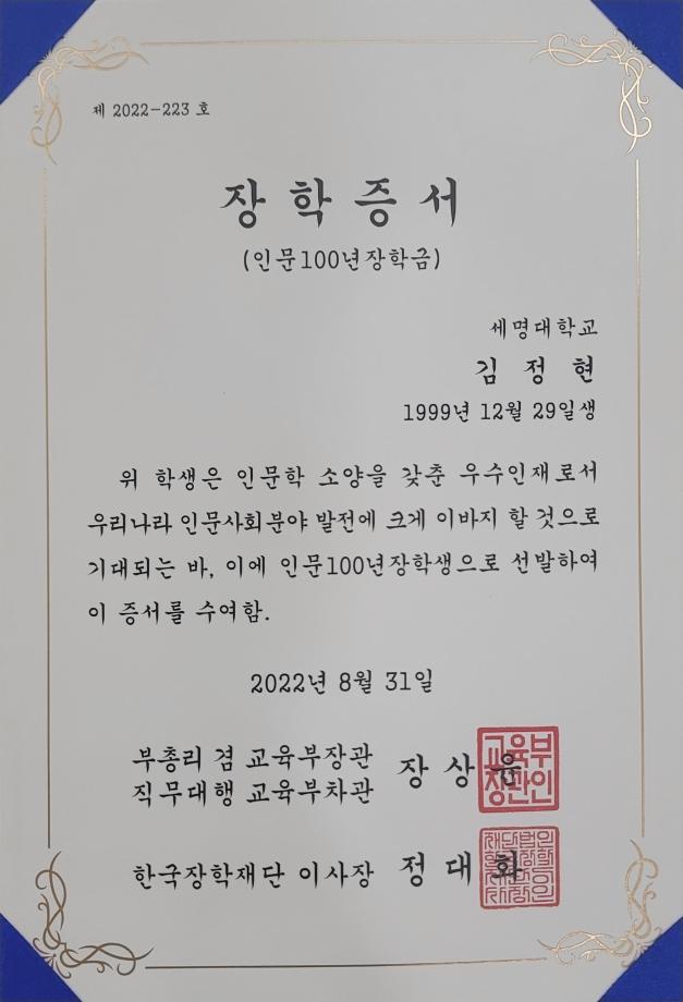 인문 100년 장학금은 인문사회계열 우수학생에게 학자금을 지원하여 인문학 소양을 갖춘 인재 양성 장학금으로,