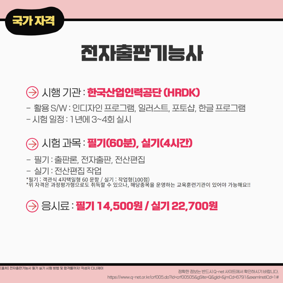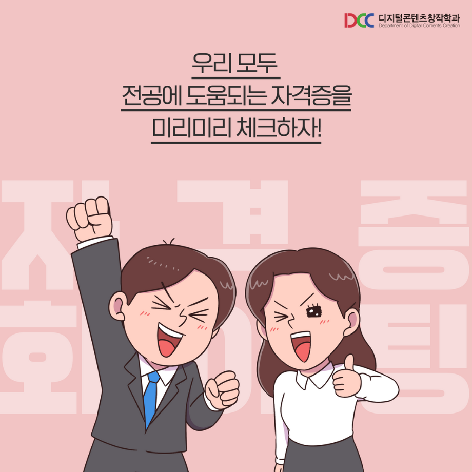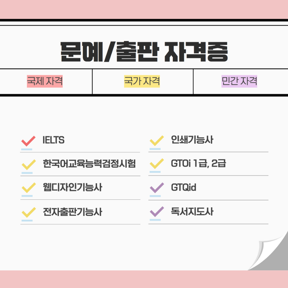 본문 시작 홈으로 MCC News 학과소개 교수소개 학과과정 MCC News MCC SNS 홈페이지가이드 학과 및 재학생 학과 및 재학생 교수 및 졸업생 미디어 정보통 학과 및 재학생 페이스북 트위터 프린트 미리 취득하면 도움 되는 자격증📝 디지털콘텐츠창작학과 5985 2023-04-07 문예,출판 관련 자격증을 알려드립니다! 자격증은 국제/국가/민간으로 나뉘며 총 6개의 자격증이 있습니다! 각 전공에 도움 되는 자격증을 미리 확인하여 취득할 수 있는 기회를 놓치지 마세요! 목록 이전🍭 오늘의 디콘 13탄 🍭 다음 🍭 오늘의 디콘 14탄 🍭 담당부서 : 미디어콘텐츠창작학과 담당자 : - 연락처 : 043-649-1741 최종수정일 : 2024-10-26 만족도조사 만족도 조사 이 페이지에서 제공하는 정보에 대하여 만족하시나요? 매우만족 만족 보통 불만족 매우불만족