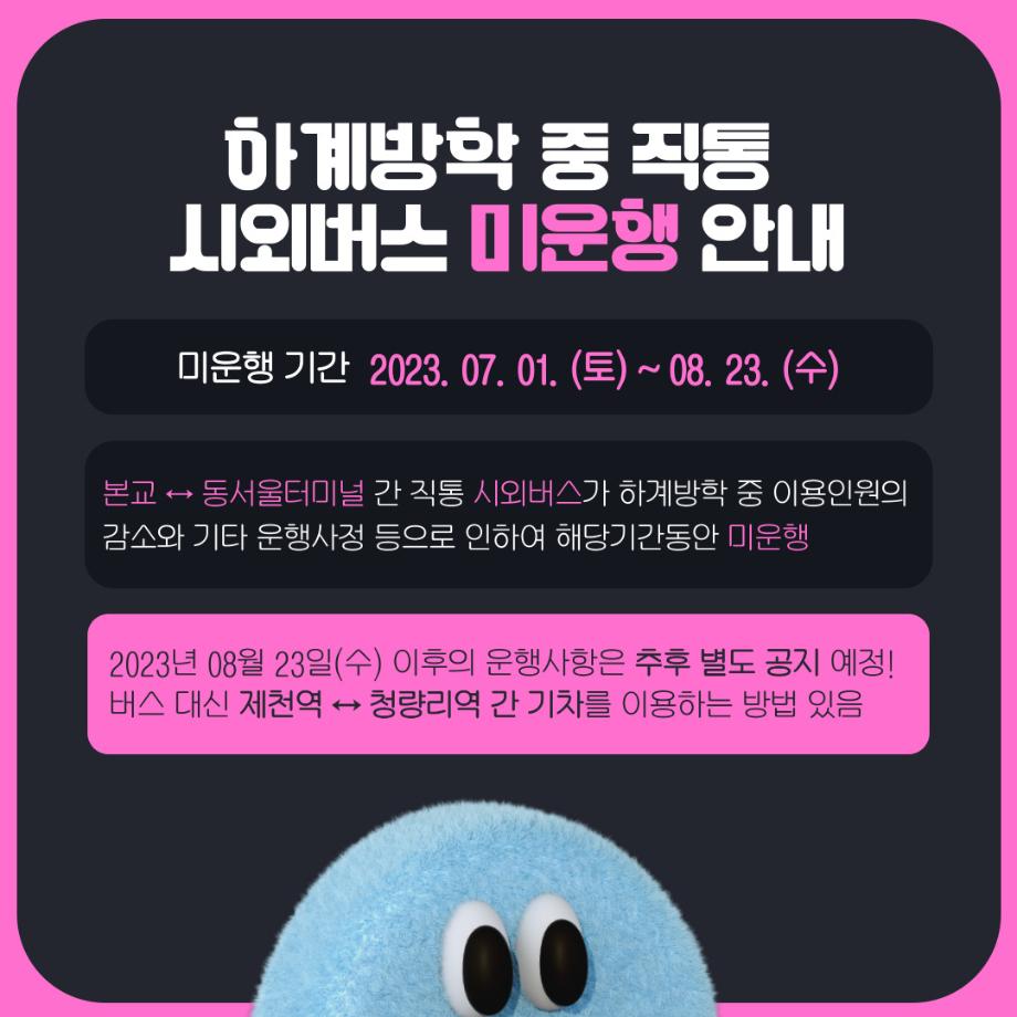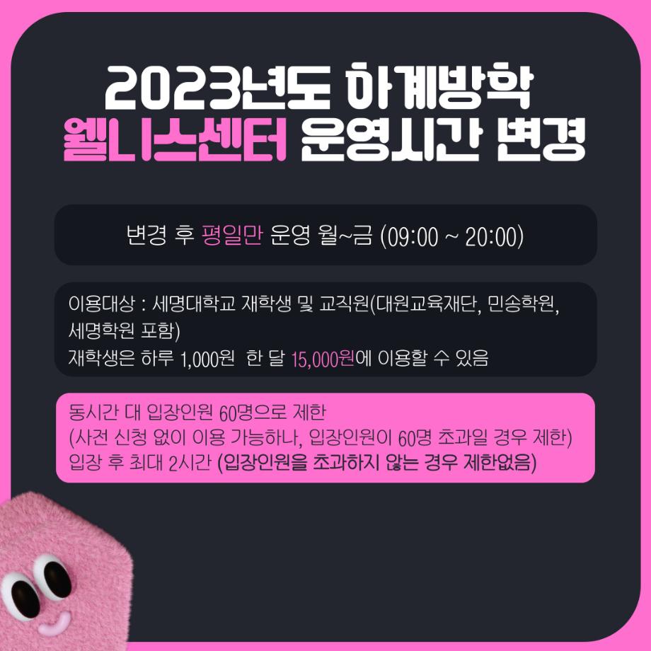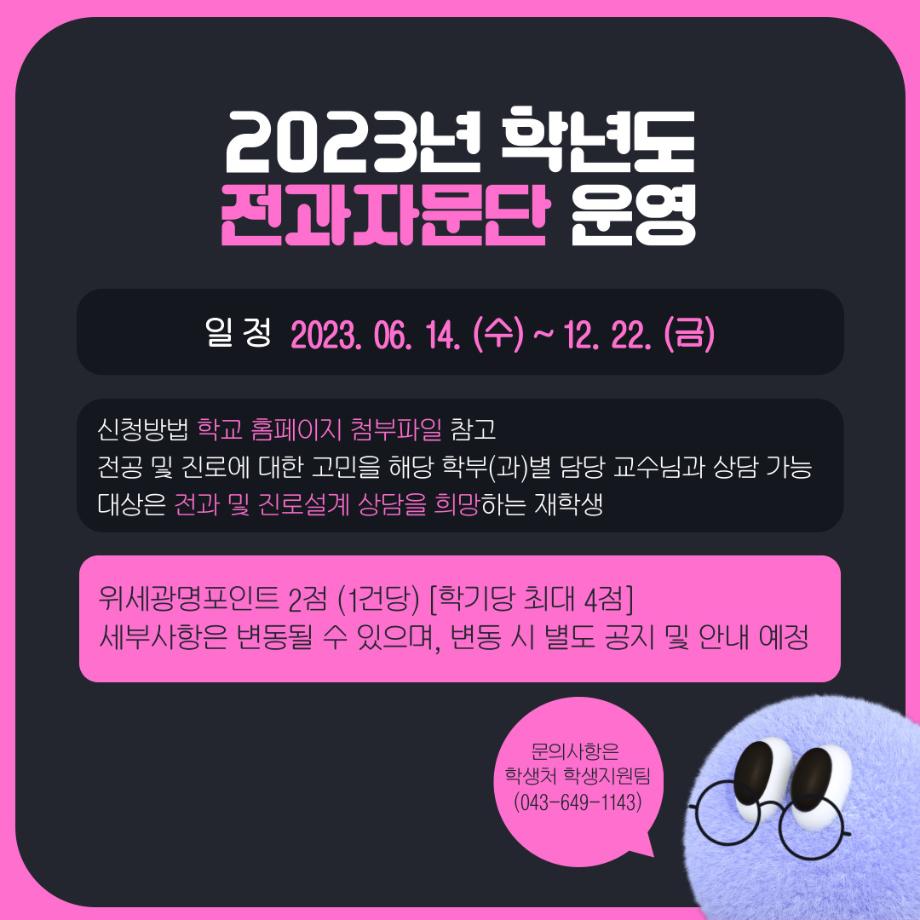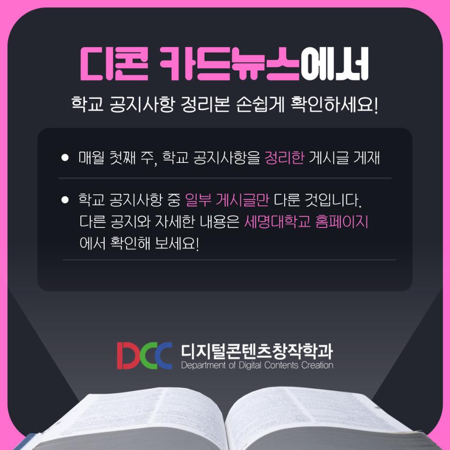 본문 시작 홈으로 MCC News 학과소개 교수소개 학과과정 MCC News MCC SNS 홈페이지가이드 학과 및 재학생 학과 및 재학생 교수 및 졸업생 미디어 정보통 학과 및 재학생 페이스북 트위터 프린트 세명대학교 홈페이지 공지사항 정리 디지털콘텐츠창작학과 3490 2023-07-07 매번 홈페이지 들어가기 귀찮은 분들을 위해 세명대학교 공지사항 요약본을 준비했습니다! 유익한 정보 얻어가시기 바랍니다! *공지사항 중 일부 게시글만 다룬 것입니다. 다른 공지사항이나 자세한 내용은 학교 홈페이지에서 확인 바랍니다 목록 이전🏫 강의실 Before & After 🏫 다음 🍭 오늘의 디콘 17탄 🍭 담당부서 : 미디어콘텐츠창작학과 담당자 : - 연락처 : 043-649-1741 최종수정일 : 2024-10-26 만족도조사 만족도 조사 이 페이지에서 제공하는 정보에 대하여 만족하시나요? 매우만족 만족 보통 불만족 매우불만족