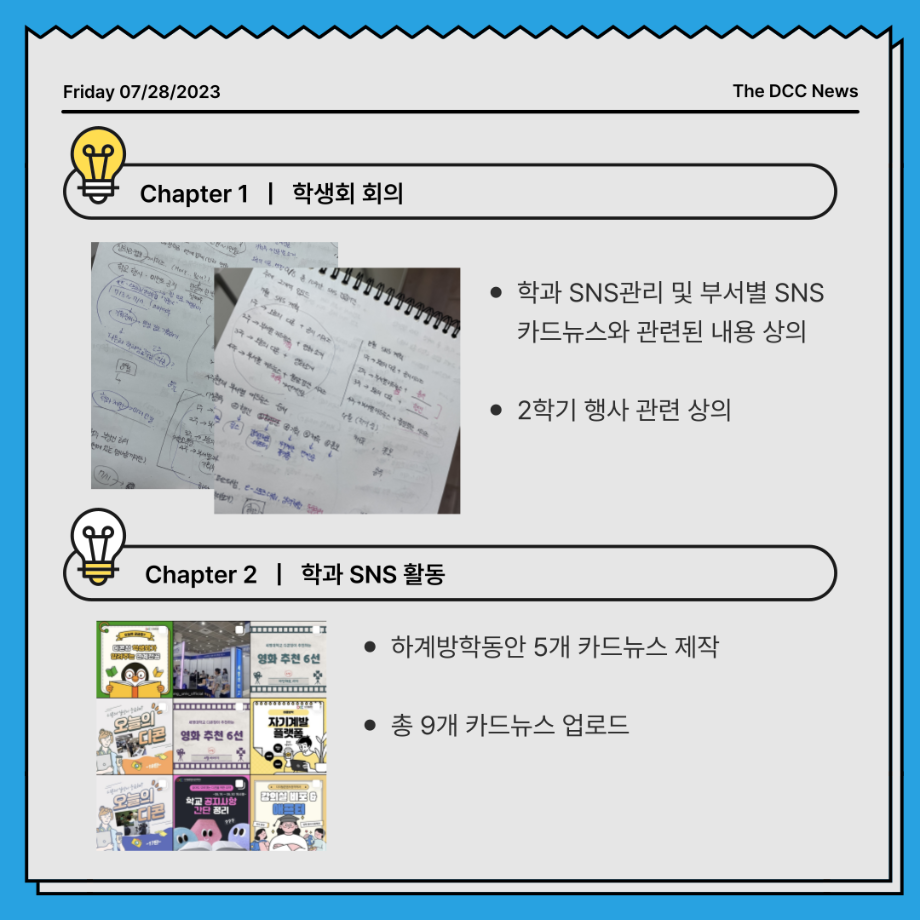 본문 시작 홈으로 MCC News 학과소개 교수소개 학과과정 MCC News MCC SNS 홈페이지가이드 학과 및 재학생 학과 및 재학생 교수 및 졸업생 미디어 정보통 학과 및 재학생 페이스북 트위터 프린트 📝디콘창 학생회 월말결산 디지털콘텐츠창작학과 4525 2023-07-28 학생회가 하는 일이 궁금하시다고요? “디콘창 학생회 월말 결산”을 통해 학생회가 무슨 일을 했는지 알려드립니다🤗 매달 마지막 주에 업로드될 예정이니 많은 관심 부탁드려요!! 목록 이전학생회가 알려주는 연계전공📚 다음 세명대학교 홈페이지 공지사항 정리 담당부서 : 미디어콘텐츠창작학과 담당자 : - 연락처 : 043-649-1741 최종수정일 : 2024-10-26 만족도조사 만족도 조사 이 페이지에서 제공하는 정보에 대하여 만족하시나요? 매우만족 만족 보통 불만족 매우불만족