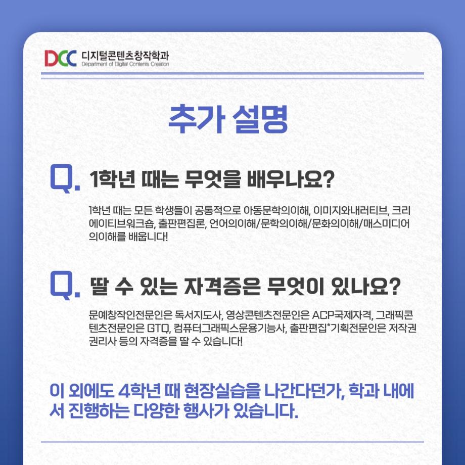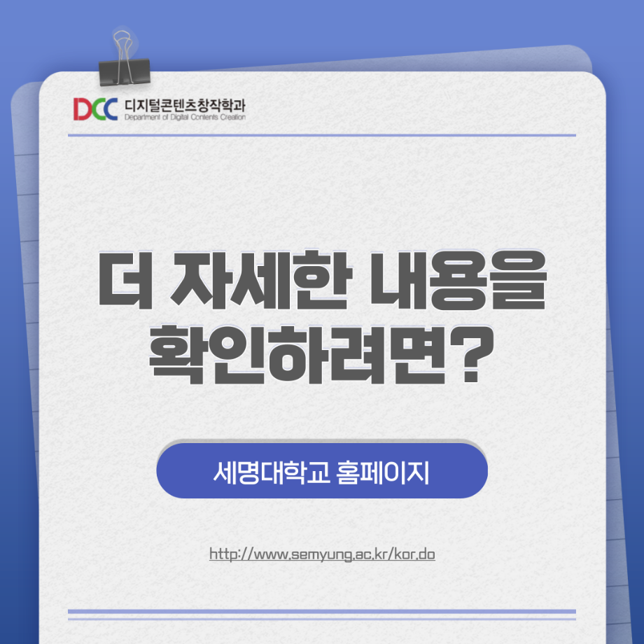 본문 시작 홈으로 MCC News 학과소개 교수소개 학과과정 MCC News MCC SNS 홈페이지가이드 학과 및 재학생 학과 및 재학생 교수 및 졸업생 미디어 정보통 학과 및 재학생 페이스북 트위터 프린트 📚디콘창 세부전공 소개📚 디지털콘텐츠창작학과 5180 2023-08-22 디지털콘텐츠창작학과 세부전공이 궁금한 학우분들을 위해 준비했습니다! 더 자세한 내용이 궁금하시다면 디지털콘텐츠창작학과 홈페이지에서 확인해볼 수 있습니다! 홈페이지 http://www.semyung.ac.kr/media-c.do 목록 이전교내 촬영 장소 추천! 다음 📷디콘창 “촬영”장비 소개📷 담당부서 : 미디어콘텐츠창작학과 담당자 : - 연락처 : 043-649-1741 최종수정일 : 2024-10-26 만족도조사 만족도 조사 이 페이지에서 제공하는 정보에 대하여 만족하시나요? 매우만족 만족 보통 불만족 매우불만족