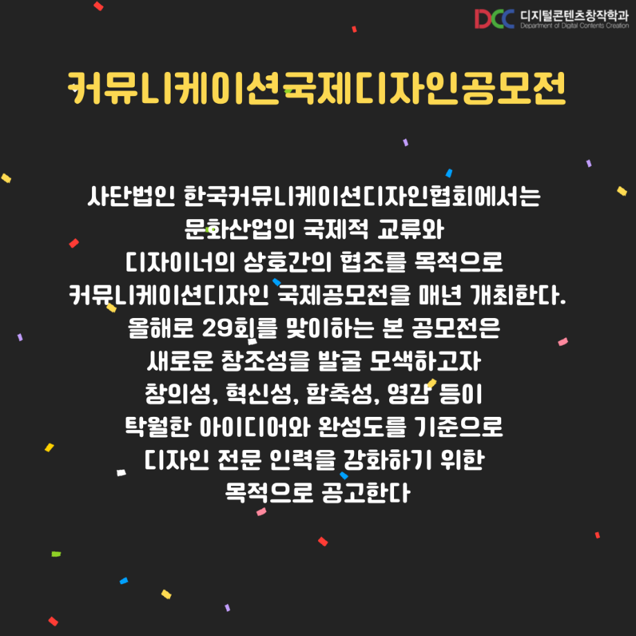본문 시작 홈으로 MCC News 학과소개 교수소개 학과과정 MCC News MCC SNS 홈페이지가이드 학과 및 재학생 학과 및 재학생 교수 및 졸업생 미디어 정보통 학과 및 재학생 페이스북 트위터 프린트 디지털콘텐츠창작학과 재학생 커뮤니케이션 국제 디자인 공모전 수상 디지털콘텐츠창작학과 8319 2023-09-13 디지털콘텐츠창작학과 학우분들의 공모전 수상을 축하드립니다! 앞으로도 여러분들의 멋진 도전을 응원합니다! 목록 이전디지털콘텐츠창작학과, 장학금 마련을 위한 양심책방 운영 다음 디지털콘텐츠창작학과 재학생 국제 디자인트렌드 대전 수상 담당부서 : 미디어콘텐츠창작학과 담당자 : - 연락처 : 043-649-1741 최종수정일 : 2024-10-26 만족도조사 만족도 조사 이 페이지에서 제공하는 정보에 대하여 만족하시나요? 매우만족 만족 보통 불만족 매우불만족