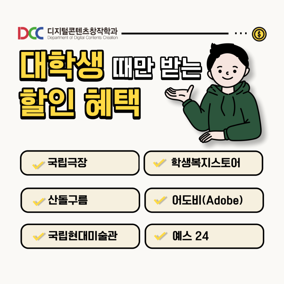 본문 시작 홈으로 MCC News 학과소개 교수소개 학과과정 MCC News MCC SNS 홈페이지가이드 학과 및 재학생 학과 및 재학생 교수 및 졸업생 미디어 정보통 학과 및 재학생 페이스북 트위터 프린트 학생회가 알려주는 재학생 할인 혜택 디지털콘텐츠창작학과 8350 2023-10-16 대학생 때만 받을 수 있는 할인 혜택이 있다고?! 학생회가 정리해서 알려드려요!! 목록 이전🍭 오늘의 디콘 21탄 🍭 다음 장학금 받는 꿀팁🎓 담당부서 : 미디어콘텐츠창작학과 담당자 : - 연락처 : 043-649-1741 최종수정일 : 2024-10-26 만족도조사 만족도 조사 이 페이지에서 제공하는 정보에 대하여 만족하시나요? 매우만족 만족 보통 불만족 매우불만족
