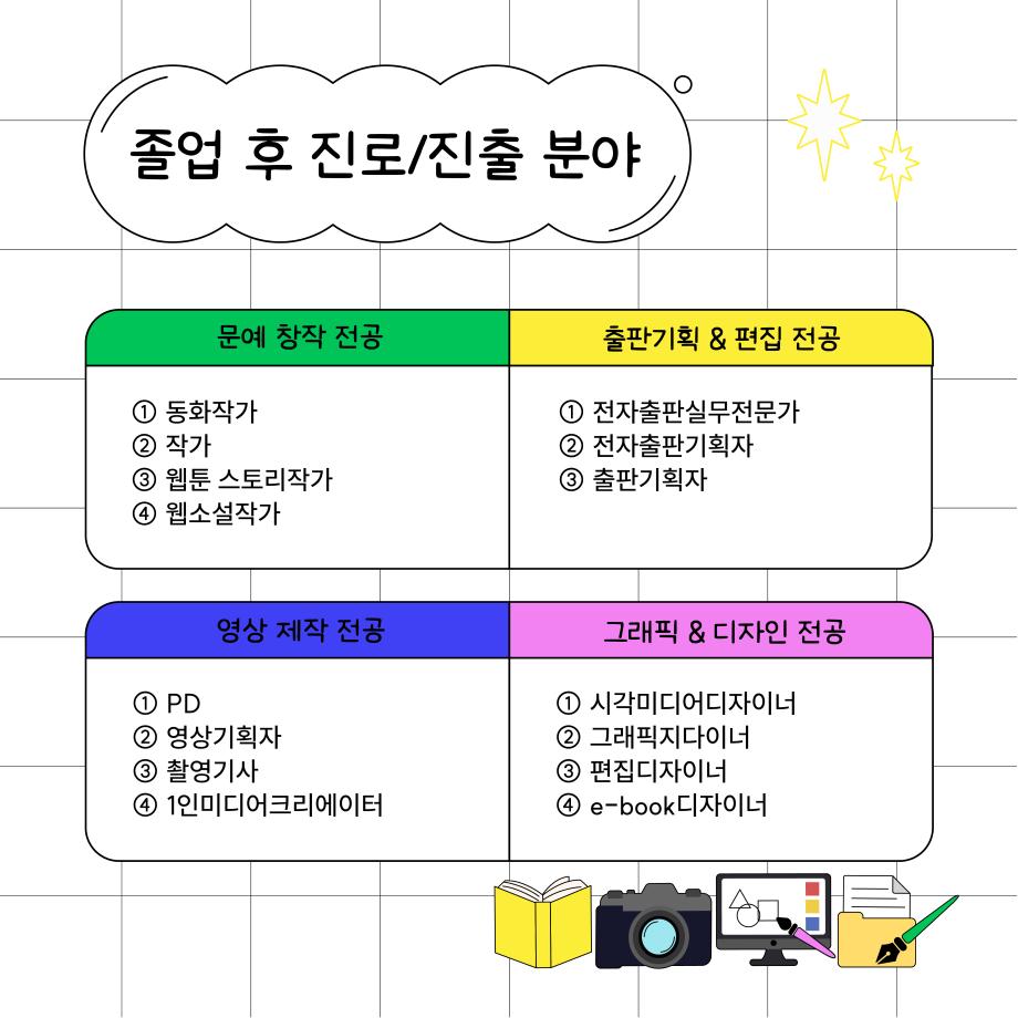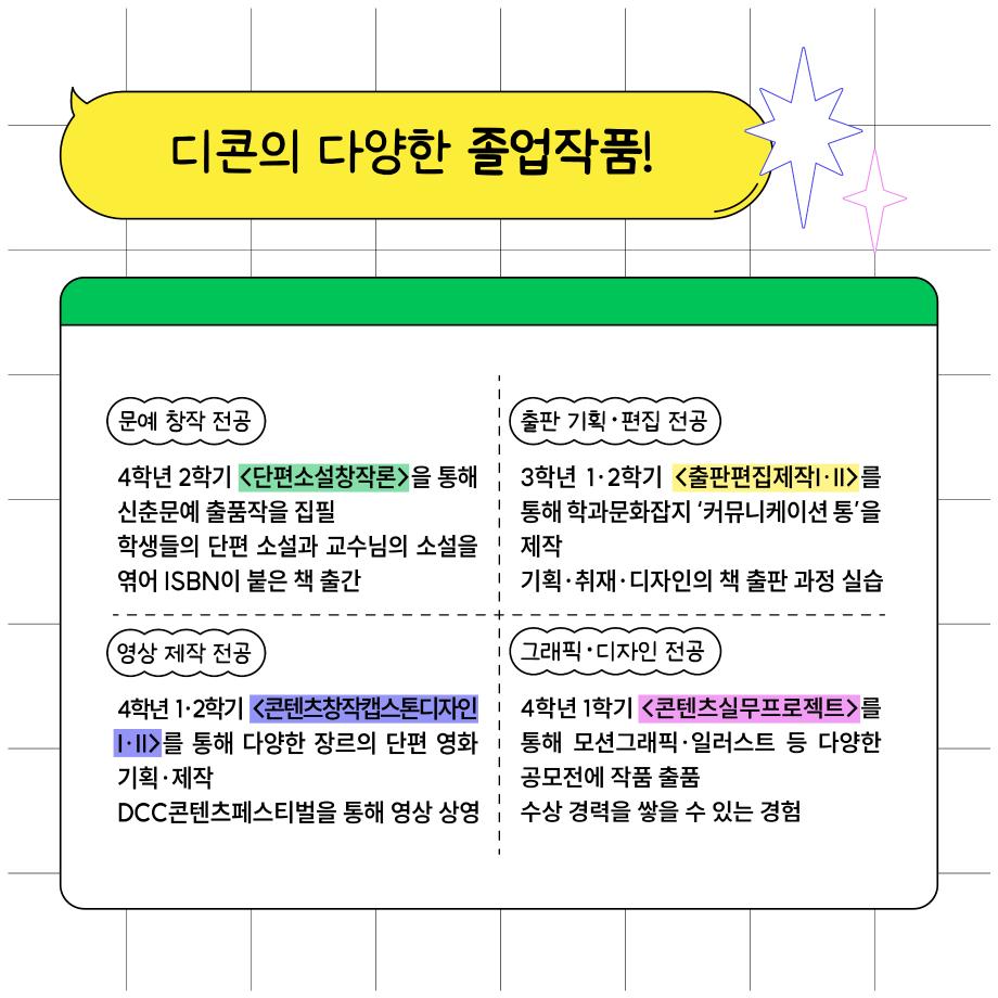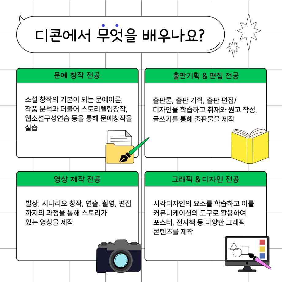 본문 시작 홈으로 MCC News 학과소개 교수소개 학과과정 MCC News MCC SNS 홈페이지가이드 학과 및 재학생 학과 및 재학생 교수 및 졸업생 미디어 정보통 학과 및 재학생 페이스북 트위터 프린트 디지털콘텐츠창작학과를 알고 싶다고? 디지털콘텐츠창작학과 6936 2023-12-29 디지털콘텐츠창작학과를 알고 싶은 예비신입생을 위해 준비했습니다! 디콘에서는 무엇을 배우는지, 어떤 졸업작품을 만드는지 등 궁금한 점을 정리해두었으니 참고하시면 좋을 것 같아요 목록 이전🎞제21회 DCC콘텐츠페스티벌 4학년 졸업작품 상영회🎞 다음 멋진 작품을 뽐내봐! 2023 캡스톤디자인 경진대회 대상: 디지털콘텐츠창작학과 깻잎방범대 팀 담당부서 : 미디어콘텐츠창작학과 담당자 : - 연락처 : 043-649-1741 최종수정일 : 2024-10-26 만족도조사 만족도 조사 이 페이지에서 제공하는 정보에 대하여 만족하시나요? 매우만족 만족 보통 불만족 매우불만족