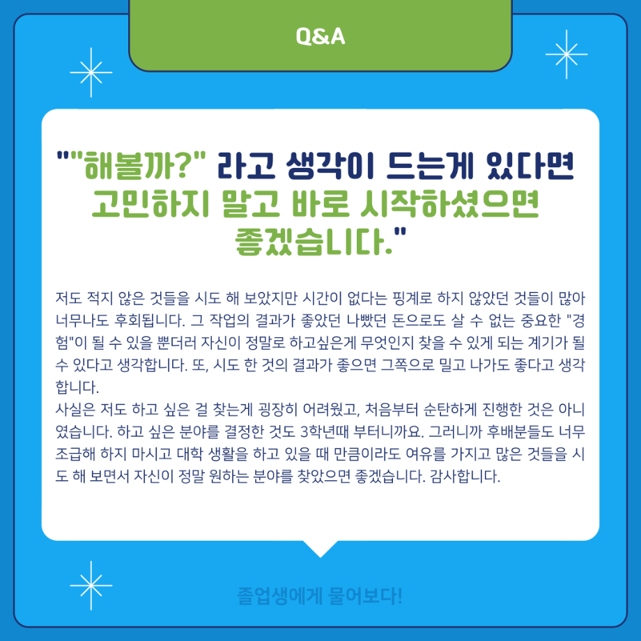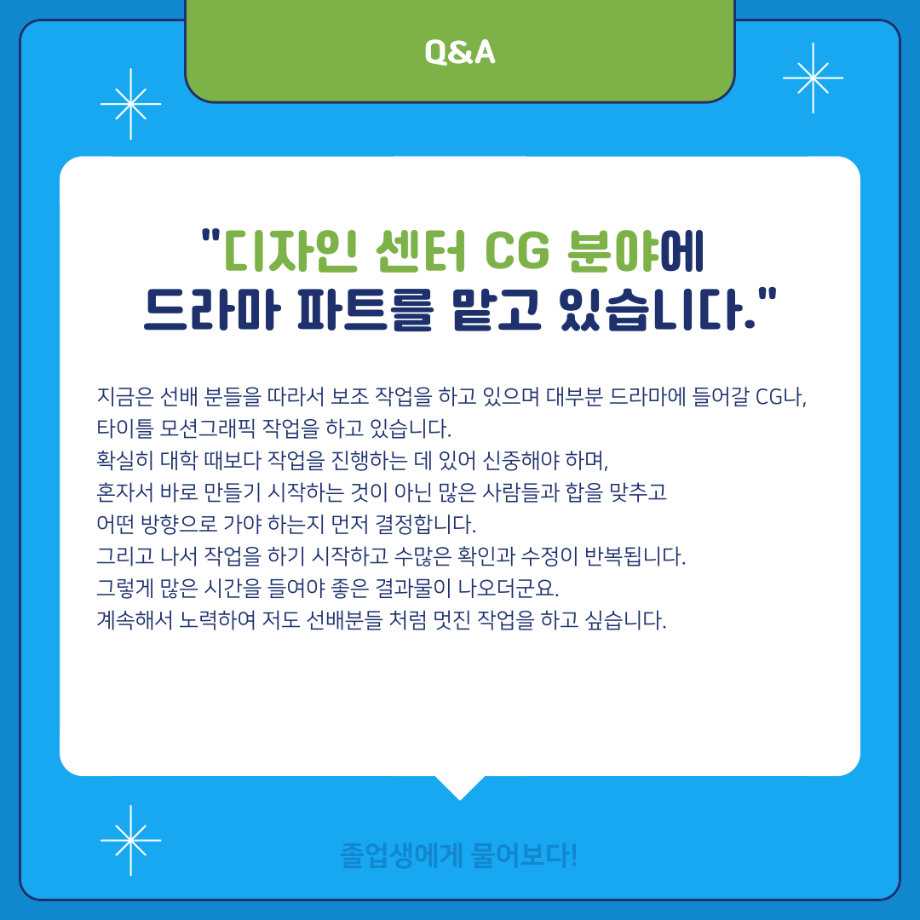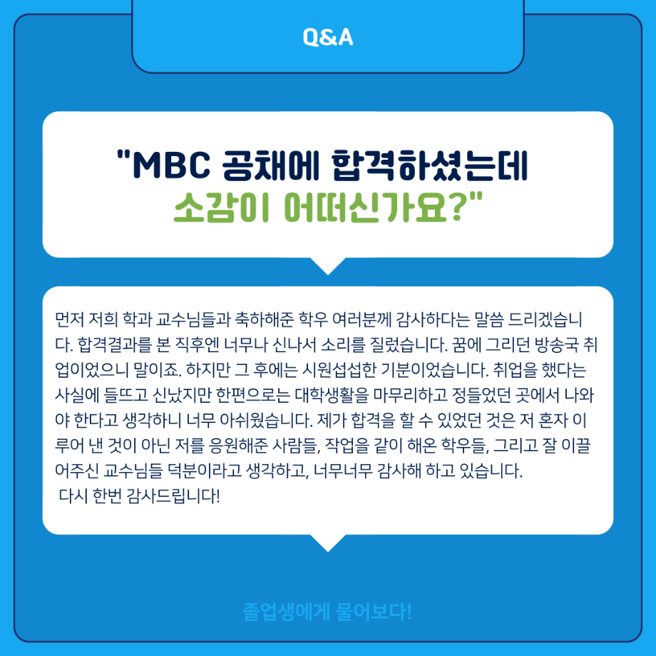 본문 시작 홈으로 MCC News 학과소개 교수소개 학과과정 MCC News MCC SNS 홈페이지가이드 학과 및 재학생 학과 및 재학생 교수 및 졸업생 미디어 정보통 학과 및 재학생 페이스북 트위터 프린트 ‼재학생이 묻고 졸업생이 답하다‼ 디지털콘텐츠창작학과 2892 2024-02-01 MBC 본사 영상미술국 공채시험 합격을 하신 김민재 선배님의 인터뷰 내용을 담았습니다! 재학생분들의 도움이 되길 바라며 많은 관심 부탁드립니다! 목록 이전배고픈 대학생을 통해 알아본 먹거리&맛집&맛팁 소개(2) 다음 👨🎓👩🎓 디지털콘텐츠창작학과 학위수여식 담당부서 : 미디어콘텐츠창작학과 담당자 : - 연락처 : 043-649-1741 최종수정일 : 2024-10-26 만족도조사 만족도 조사 이 페이지에서 제공하는 정보에 대하여 만족하시나요? 매우만족 만족 보통 불만족 매우불만족