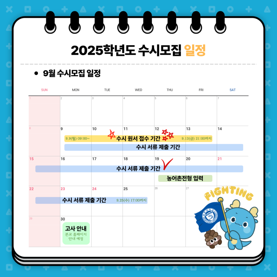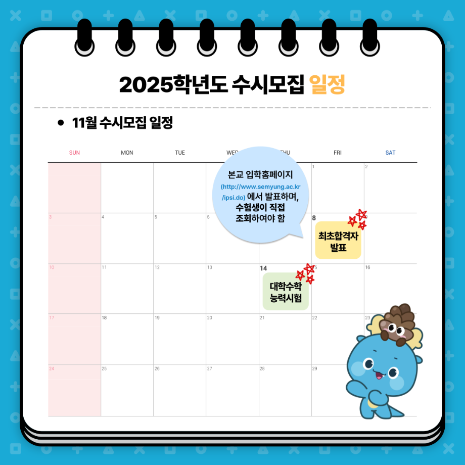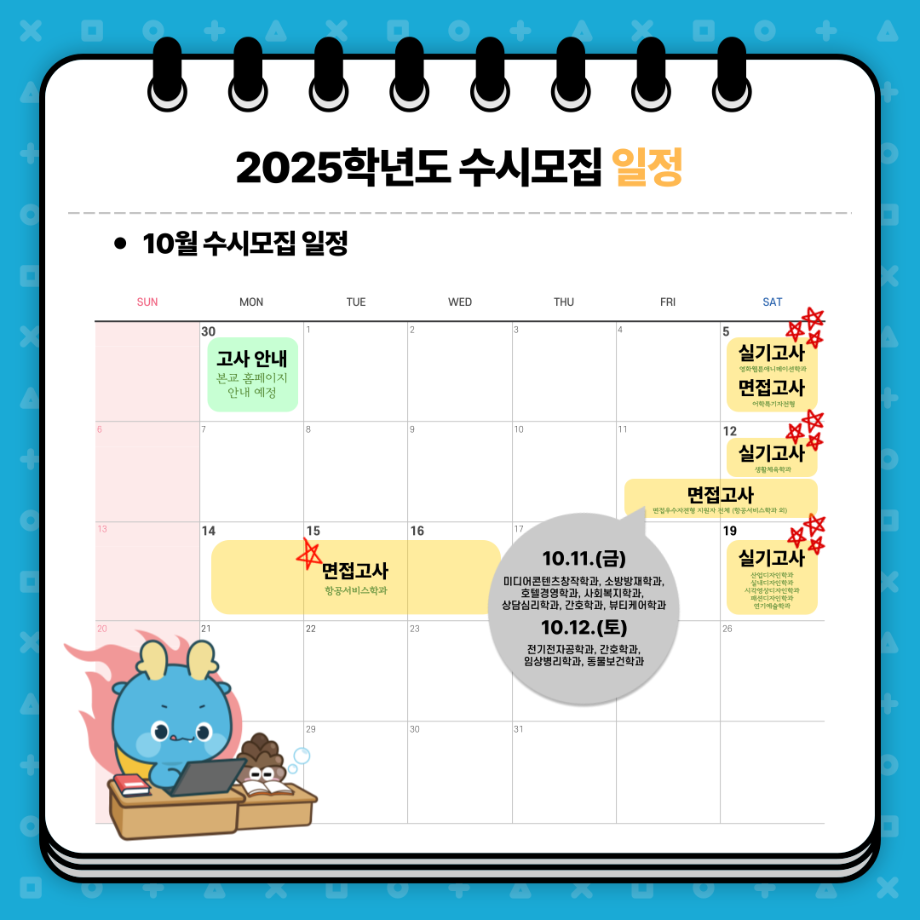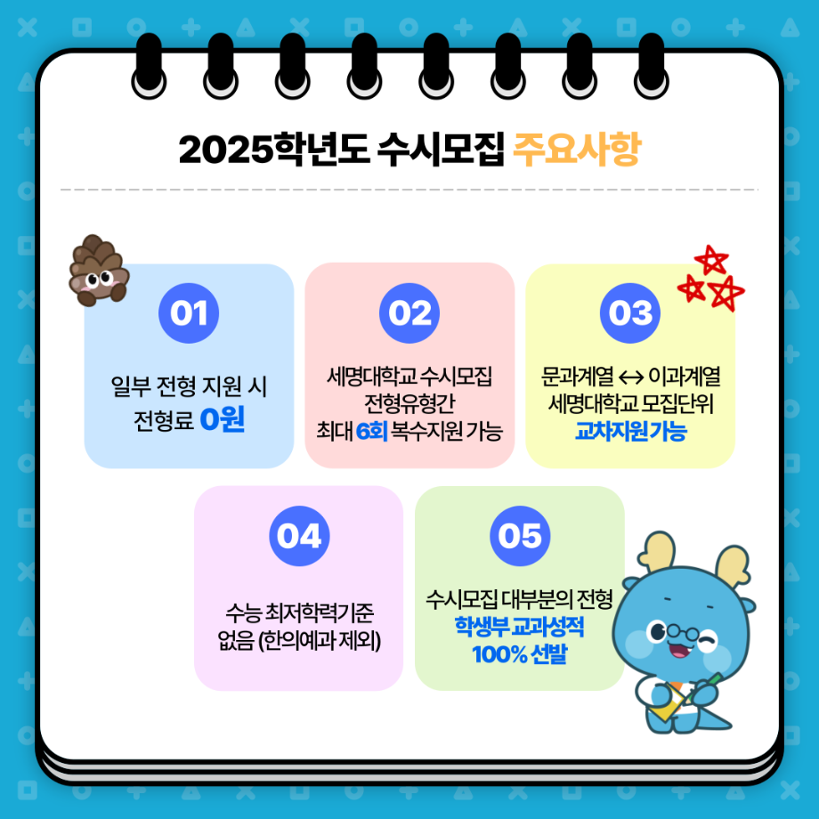 본문 시작 홈으로 MCC News 학과소개 교수소개 학과과정 MCC News MCC SNS 홈페이지가이드 학과 및 재학생 학과 및 재학생 교수 및 졸업생 미디어 정보통 학과 및 재학생 페이스북 트위터 프린트 📌 세명대학교 2025학년도 수시모집 주요사항 안내 📌 디지털콘텐츠창작학과 2455 2024-08-20 📌 세명대학교 2025학년도 수시모집 주요사항 안내 📌 예비 세명인들 주목~!!🔥 수시모집 주요사항부터 9월, 10월, 11월 일정까지! ✨세명대학교 2025학년도 수시모집 주요사항✨을 안내합니다👏 9월 9일부터 13일! 수시 원서 접수하고 💙재미있는 경험 가득한 세명대💙에서 만나요! 목록 이전미디어콘텐츠창작학과의 세계를 알아 보자! 다음 세명대학교에서 알려주는 입시 소식! 담당부서 : 미디어콘텐츠창작학과 담당자 : - 연락처 : 043-649-1741 최종수정일 : 2024-10-26 만족도조사 만족도 조사 이 페이지에서 제공하는 정보에 대하여 만족하시나요? 매우만족 만족 보통 불만족 매우불만족